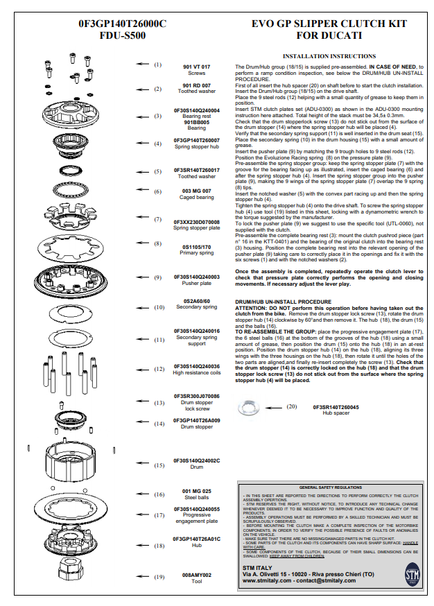 STM EVO GP suha spojka za Ducati Panigale 1199/1299 zamjenjuje originalnu mokru spojku s performantnijom suhom spojkom. Smanjuje gubitak snage i poboljšava kontrolu i performanse na trkačkoj stazi i u sportskom radu. U usporedbi s EVO SBK varijantom, ova spojka ima vanjski koš s 40 zuba i dodatne hladnjake (vidi sliku Z40 koš) za još bolje odvođenje topline.