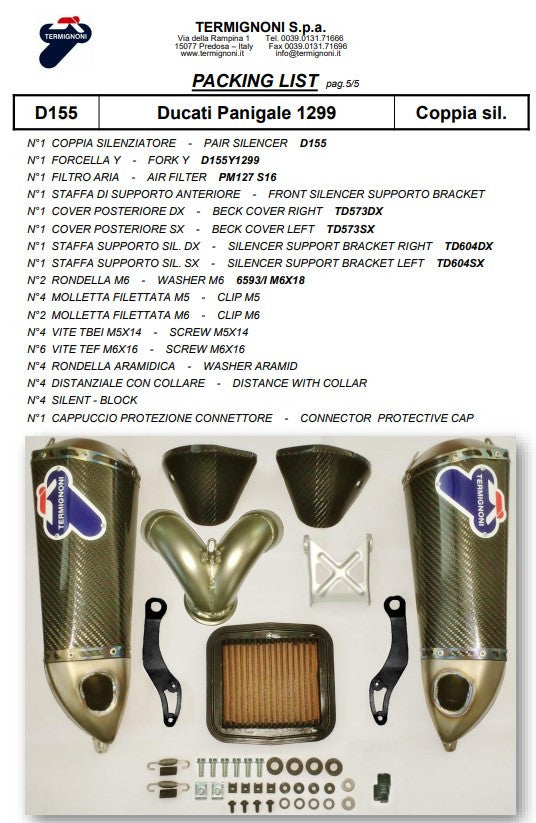 Termignoni Slip-On Kit Carbon za Ducati Panigale 959 (2016-2019) posebno je razvijen za trkačku upotrebu kako bi se optimizirala snaga i poboljšala dynamika vožnje. Kit se sastoji od dva lagana Carbon/Titanium prigušivača (D155102CPT) i jednog povezivog cijevi (D155Y2), koji osigurava optimizirano ispušno vođenje. Ovaj Slip-On Kit nije odobren za cestovni promet, već je isključivo namijenjen za trkačke svrhe.