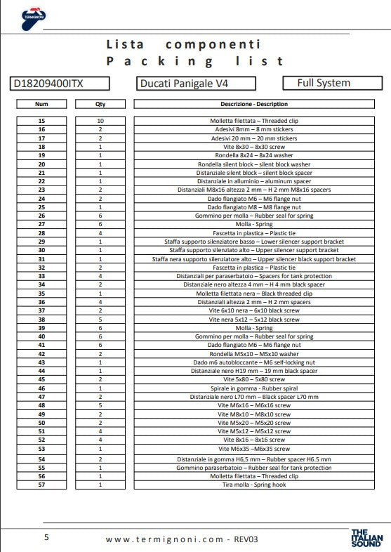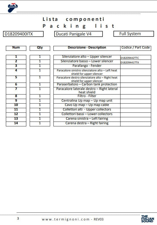 Termignoni 4USCITE kompletna ispušna cijev za Ducati Panigale V4 R (2019-2024) posebno je razvijena za upotrebu na stazi, kako bi se postigla najbolja izvedba kroz cijeli raspon okretnog momenta i snage. Ova ispušna cijev, koja se koristi u BSB i SBK, idealan je izbor za vozače koji žele izvući maksimalni potencijal svog Ducatija na stazi ili na cesti.